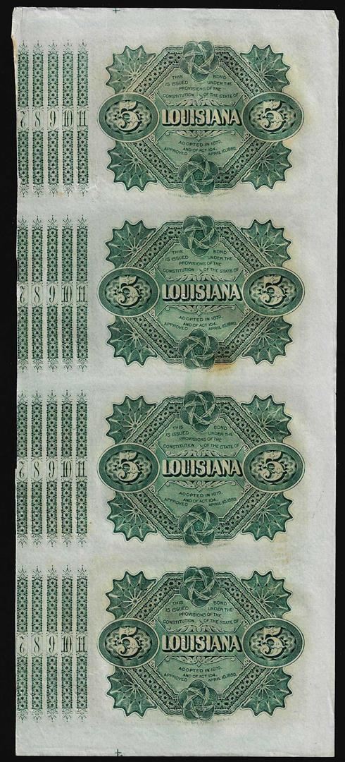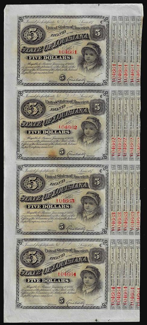 Uncut Sheet of (4) State of Louisiana Baby Bond Obsolete Notes