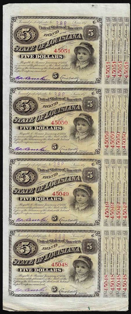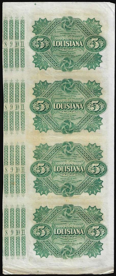 Uncut Sheet of (4) State of Louisiana Baby Bond Obsolete Notes