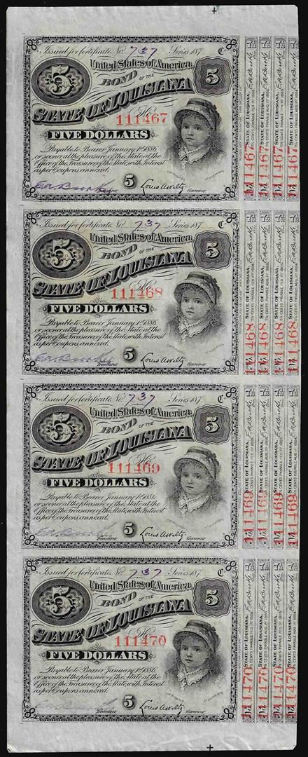 One Uncut Sheet of (4) State of Louisiana Baby Bond Obsolete Notes.