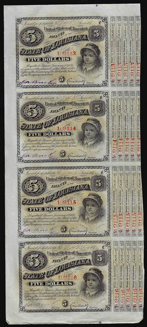 One Uncut Sheet of (4) State of Louisiana Baby Bond Obsolete Notes.