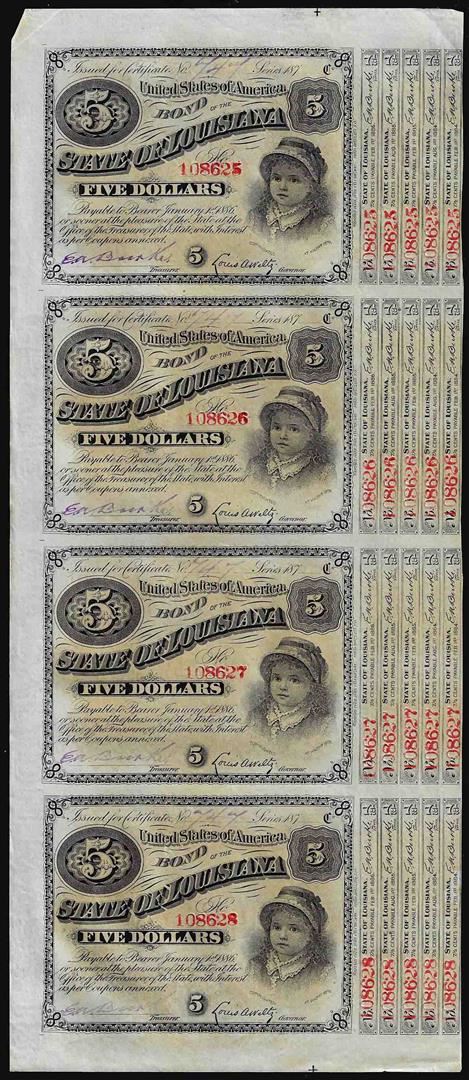 One Uncut Sheet of (4) State of Louisiana Baby Bond Obsolete Notes.