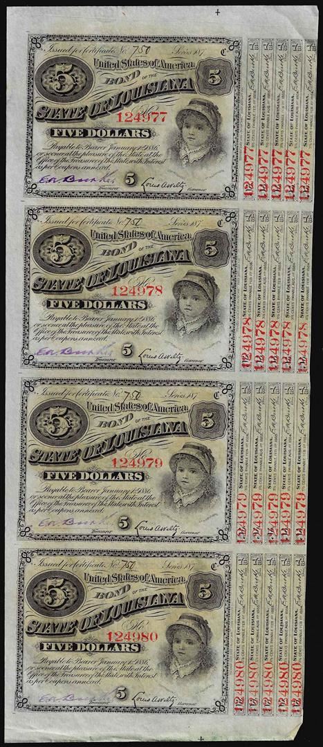 One Uncut Sheet of (4) State of Louisiana Baby Bond Obsolete Notes.