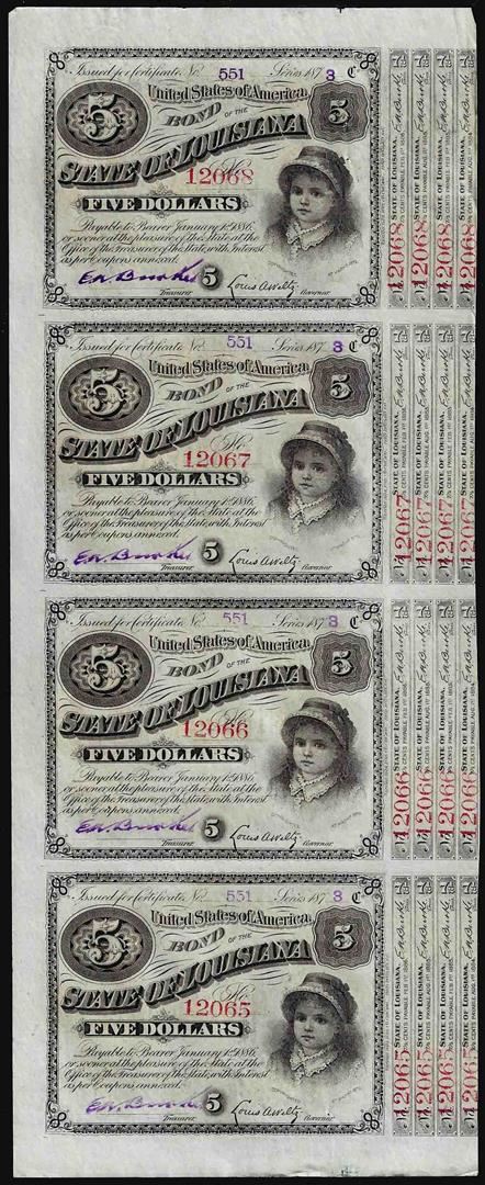 One Uncut Sheet of (4) State of Louisiana Baby Bond Obsolete Notes.