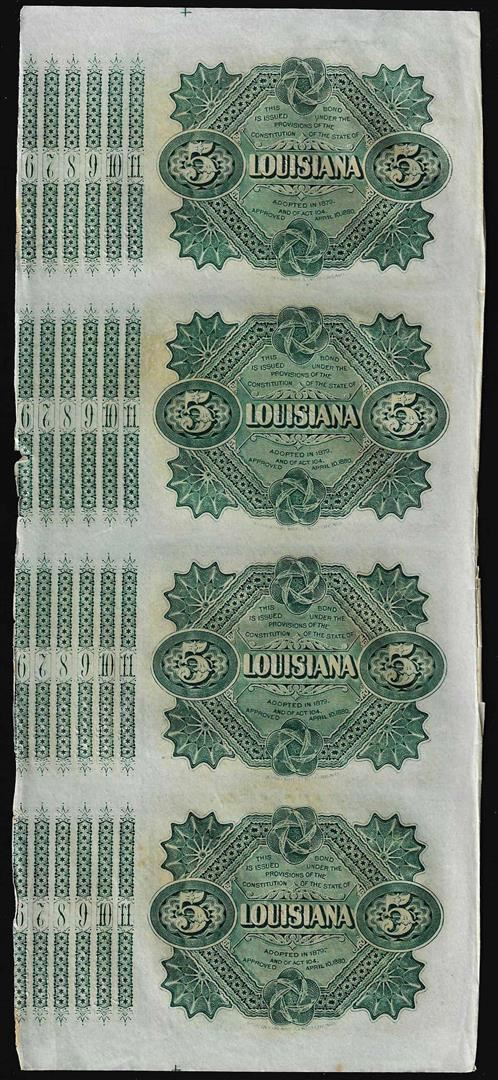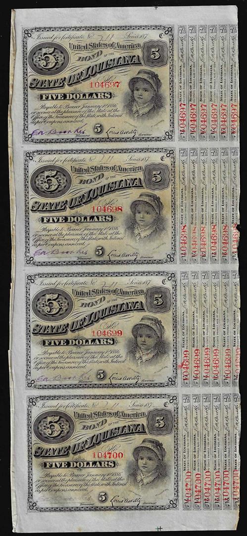 One Uncut Sheet of (4) State of Louisiana Baby Bond Obsolete Notes.