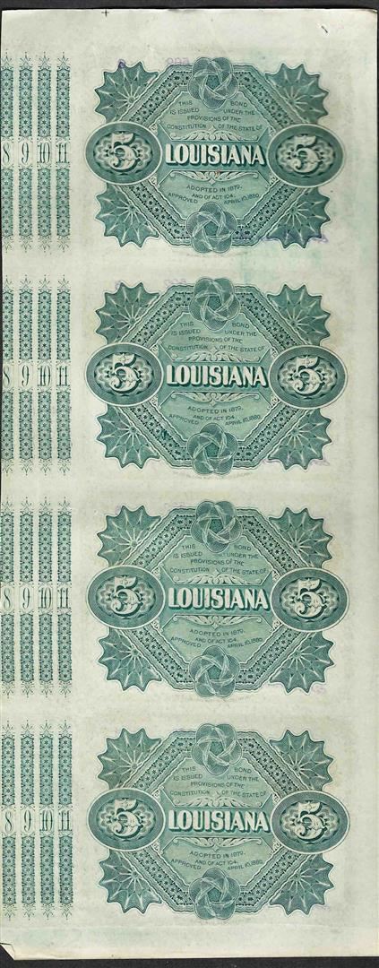One Uncut Sheet of (4) State of Louisiana Baby Bond Obsolete Notes.