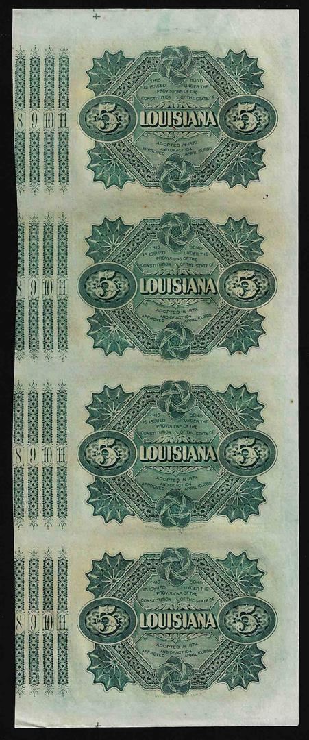 One Uncut Sheet of (4) State of Louisiana Baby Bond Obsolete Notes.