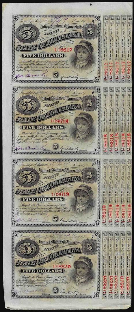 One Uncut Sheet of (4) State of Louisiana Baby Bond Obsolete Notes.