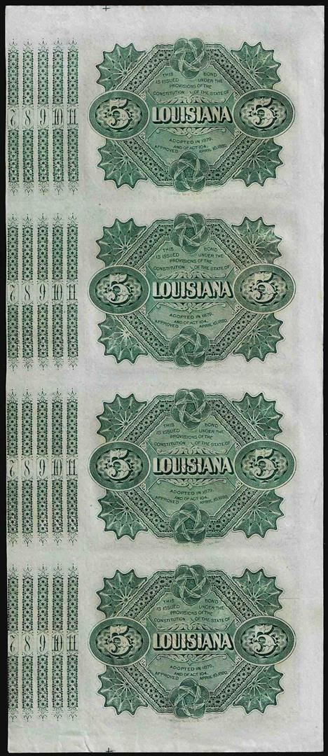 One Uncut Sheet of (4) State of Louisiana Baby Bond Obsolete Notes.