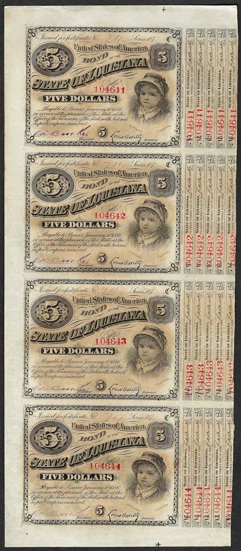 Uncut Sheet of (4) State of Louisiana Baby Bond Obsolete Notes