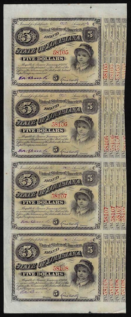 One Uncut Sheet of (4) State of Louisiana Baby Bond Obsolete Notes.