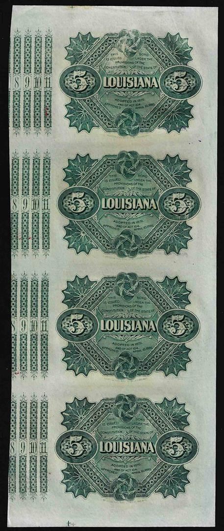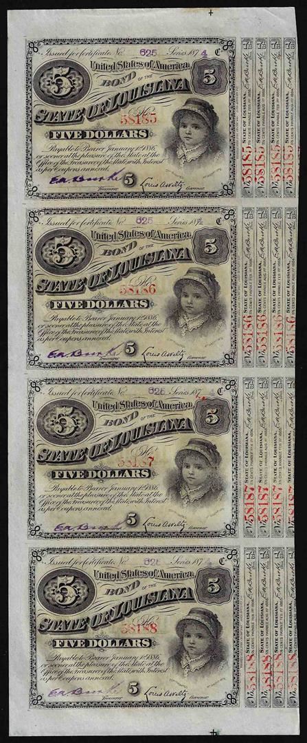 One Uncut Sheet of (4) State of Louisiana Baby Bond Obsolete Notes.