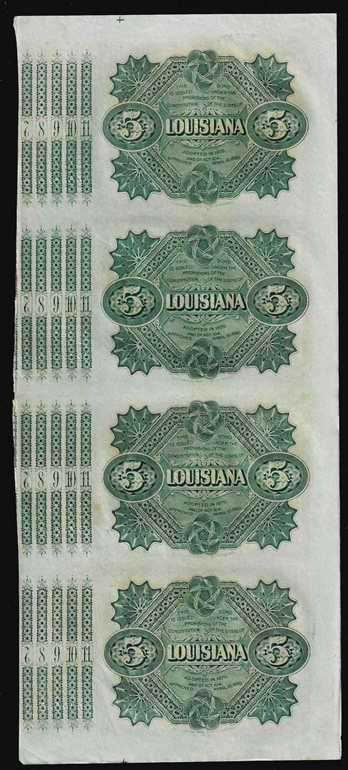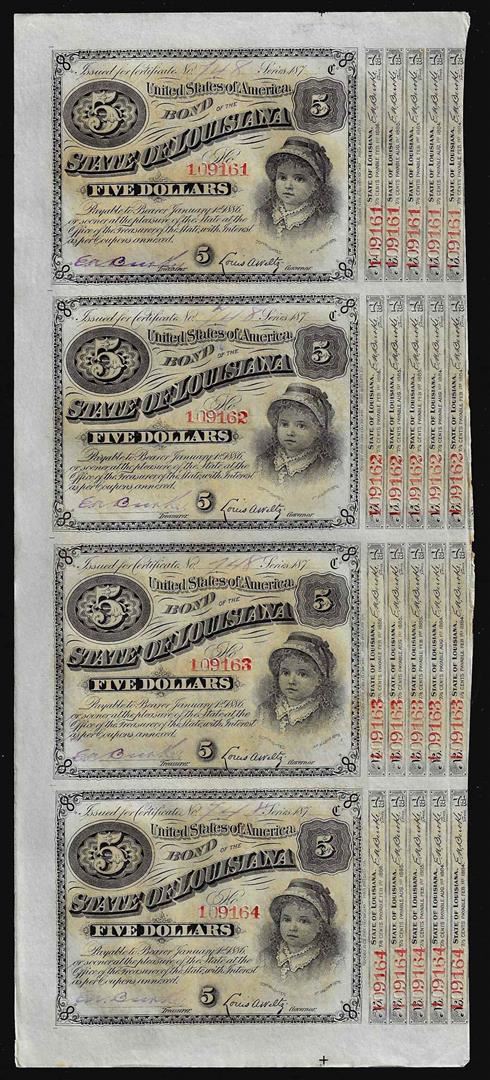 One Uncut Sheet of (4) State of Louisiana Baby Bond Obsolete Notes.