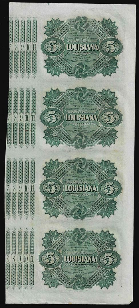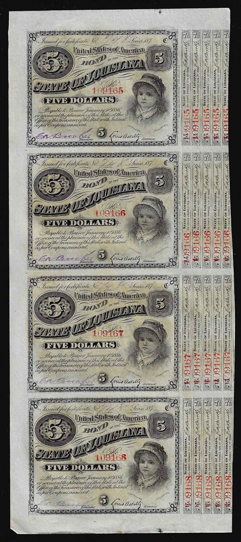 One Uncut Sheet of (4) State of Louisiana Baby Bond Obsolete Notes.