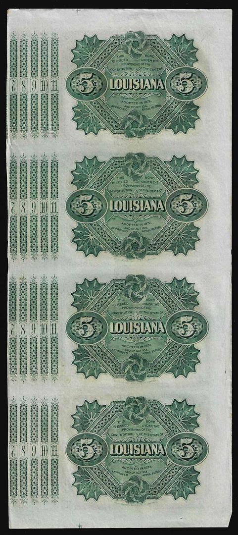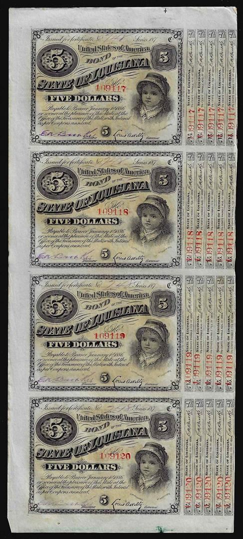 One Uncut Sheet of (4) State of Louisiana Baby Bond Obsolete Notes.