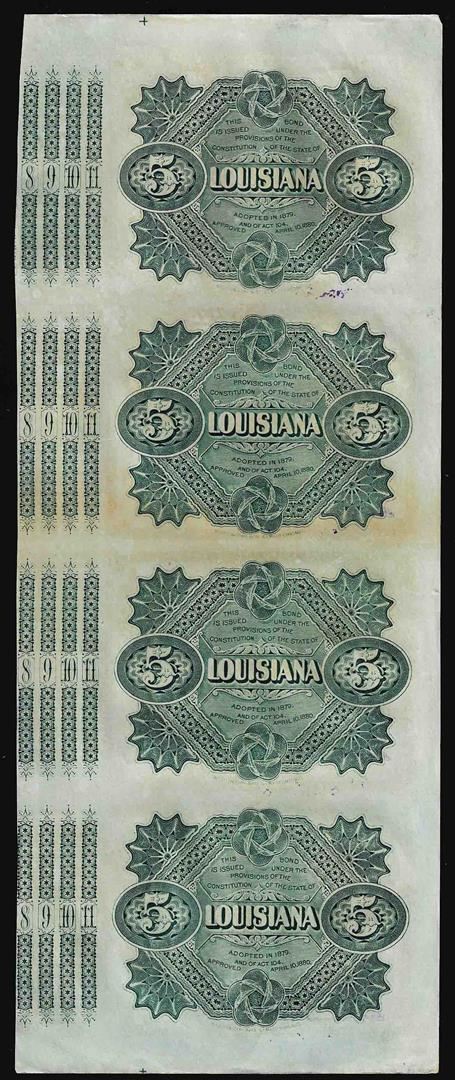 One Uncut Sheet of (4) State of Louisiana Baby Bond Obsolete Notes.