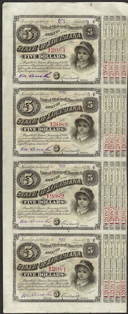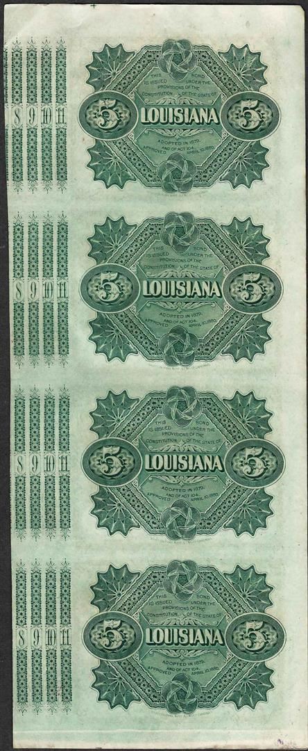 One Uncut Sheet of (4) State of Louisiana Baby Bond Obsolete Notes.