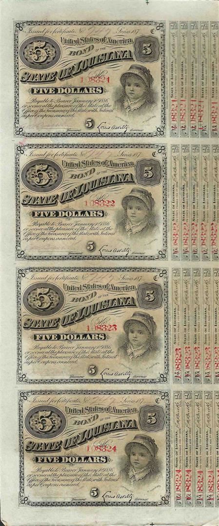Uncut Sheet of (4) State of Louisiana Baby Bond Obsolete Notes