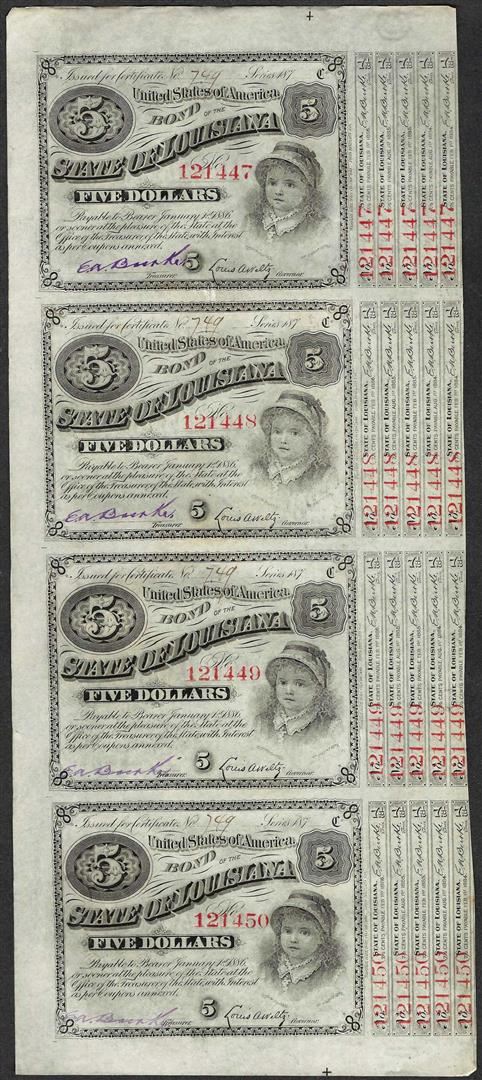Uncut Sheet of (4) State of Louisiana Baby Bond Obsolete Notes