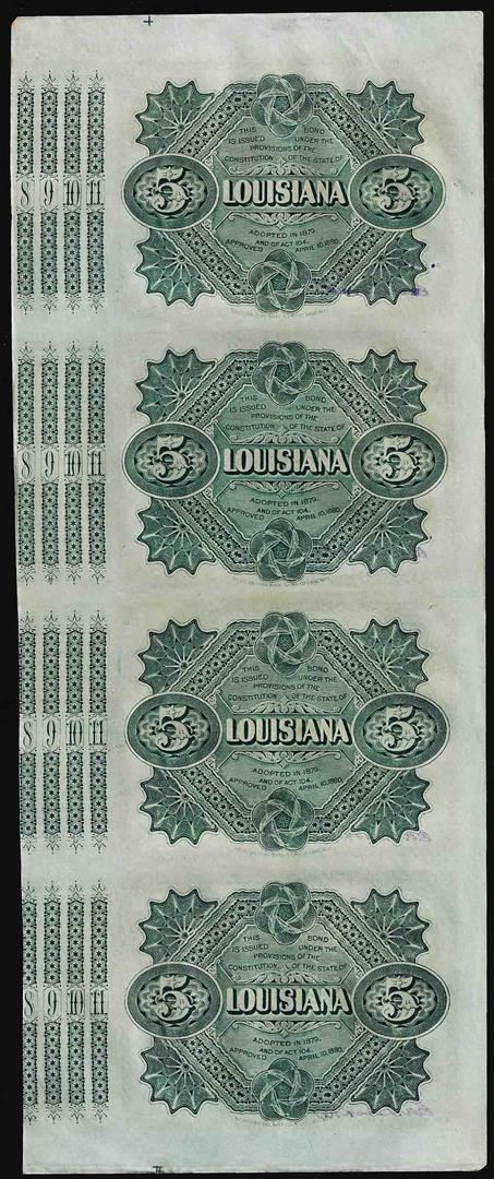 One Uncut Sheet of (4) State of Louisiana Baby Bond Obsolete Notes.