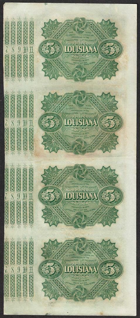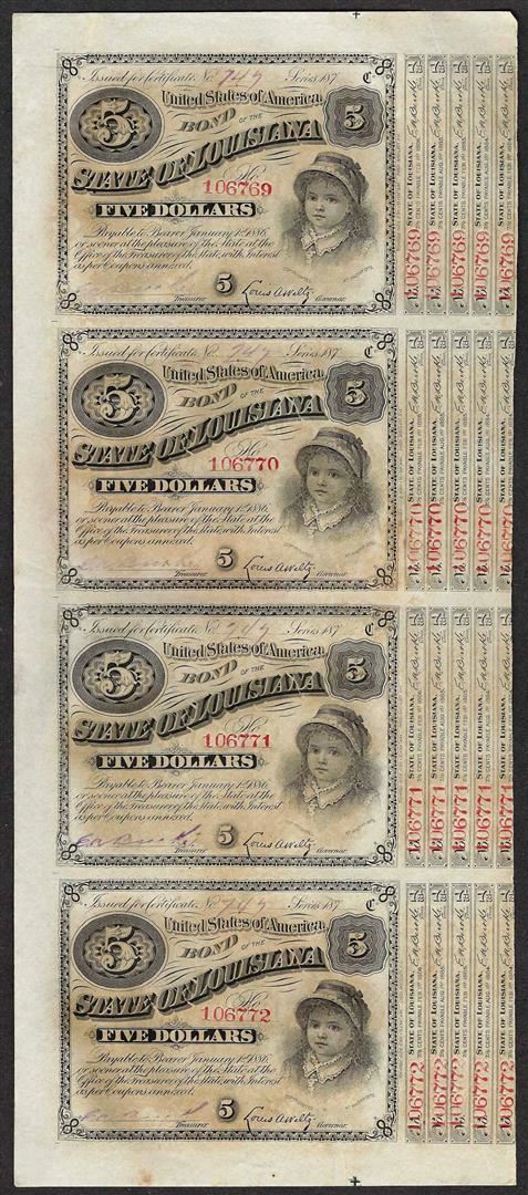 Uncut Sheet of (4) State of Louisiana Baby Bond Obsolete Notes