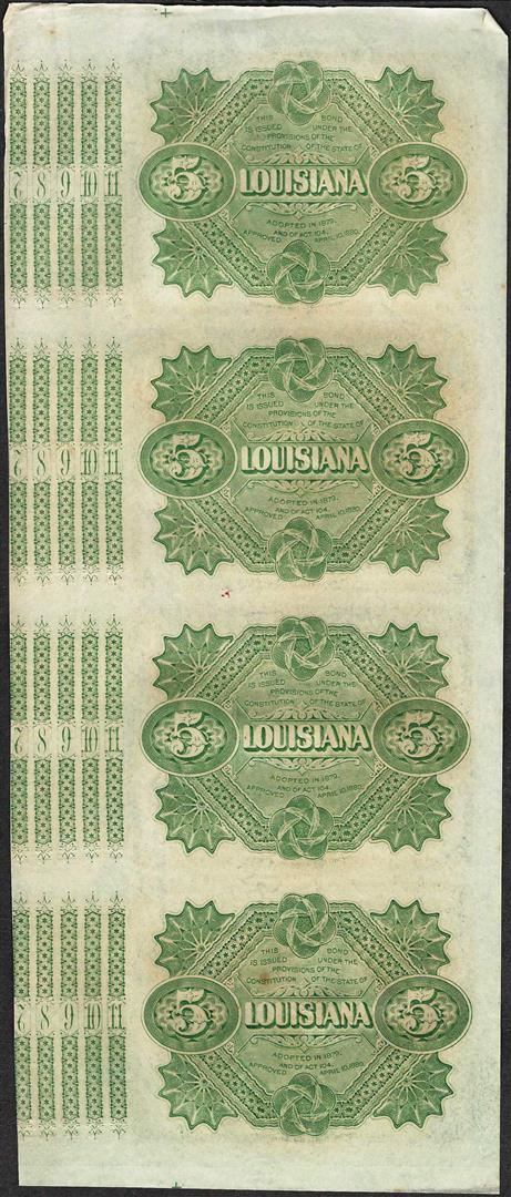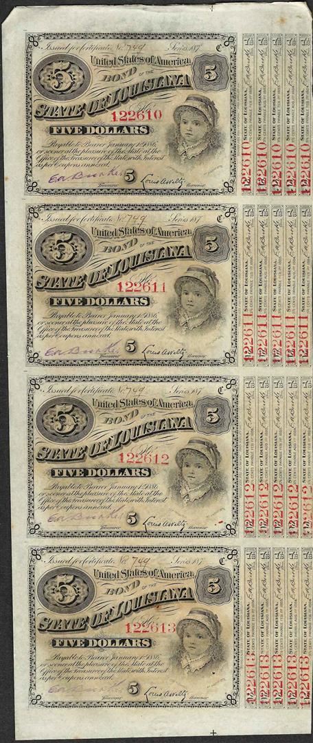 One Uncut Sheet of (4) State of Louisiana Baby Bond Obsolete Notes.
