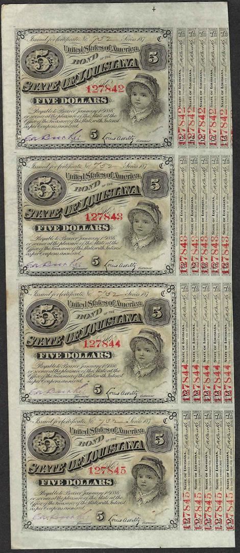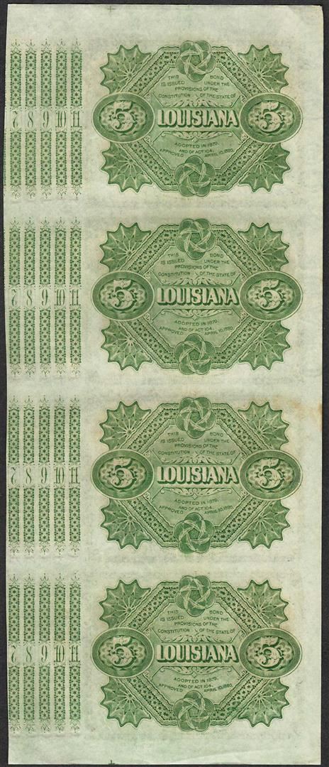One Uncut Sheet of (4) State of Louisiana Baby Bond Obsolete Notes.