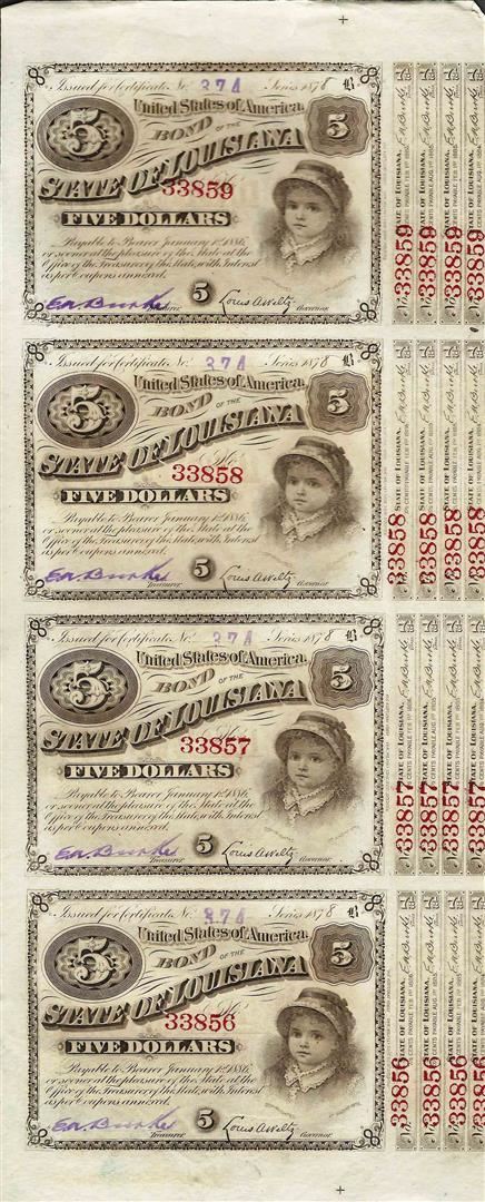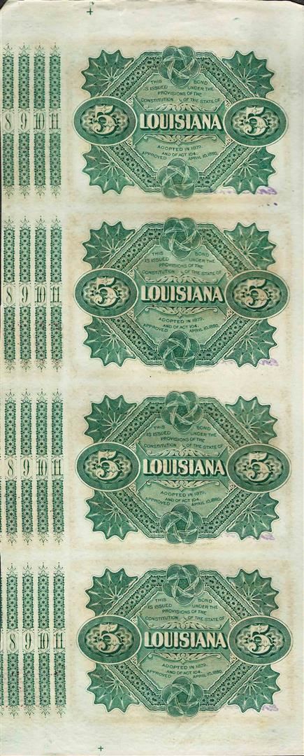 Uncut Sheet of (4) State of Louisiana Baby Bond Obsolete Notes
