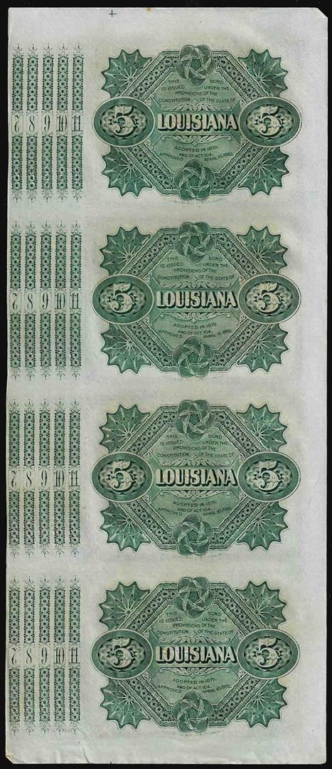One Uncut Sheet of (4) State of Louisiana Baby Bond Obsolete Notes.