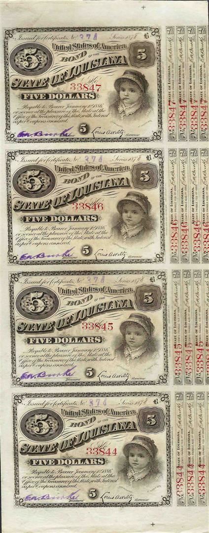 Uncut Sheet of (4) State of Louisiana Baby Bond Obsolete Notes