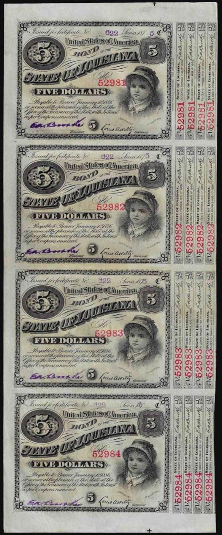 One Uncut Sheet of (4) State of Louisiana Baby Bond Obsolete Notes.