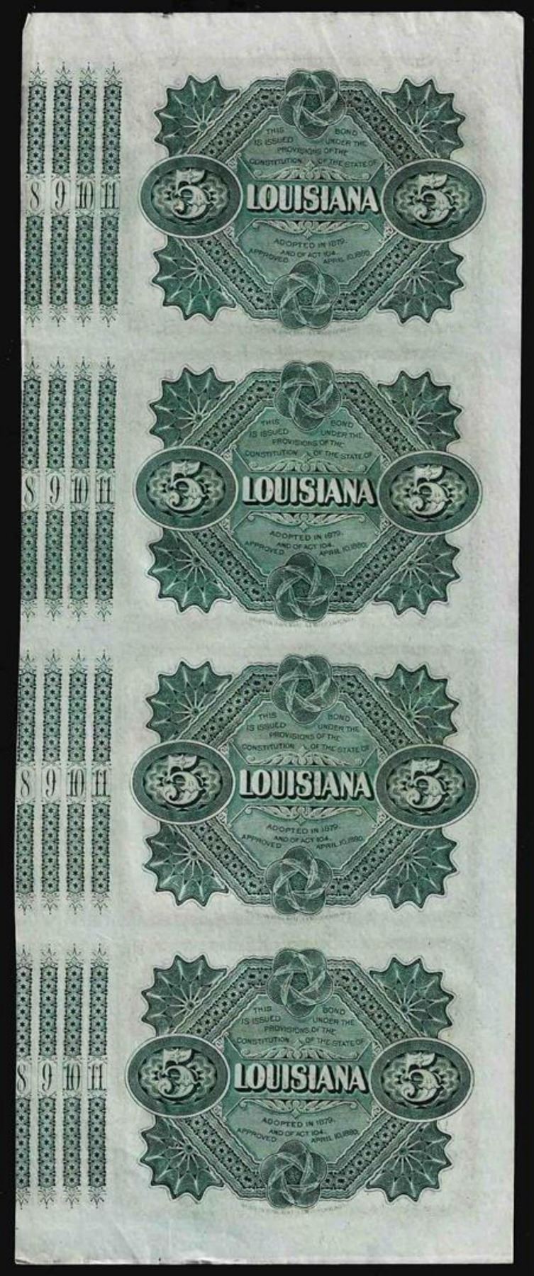 One Uncut Sheet of (4) State of Louisiana Baby Bond Obsolete Notes.