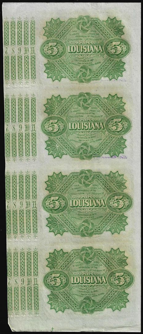 One Uncut Sheet of (4) State of Louisiana Baby Bond Obsolete Notes.