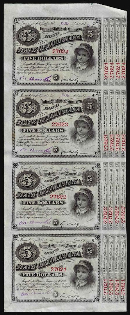 One Uncut Sheet of (4) State of Louisiana Baby Bond Obsolete Notes.