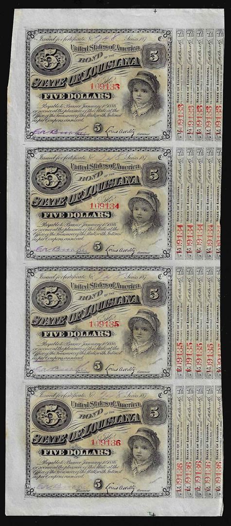 One Uncut Sheet of (4) State of Louisiana Baby Bond Obsolete Notes.