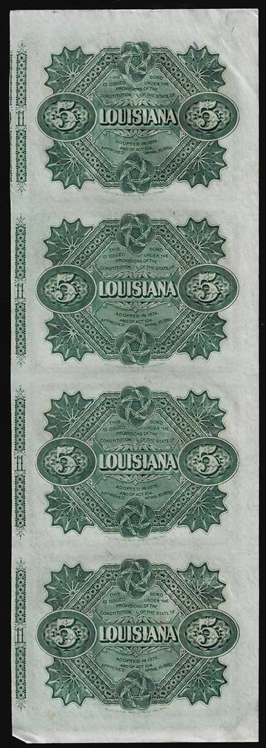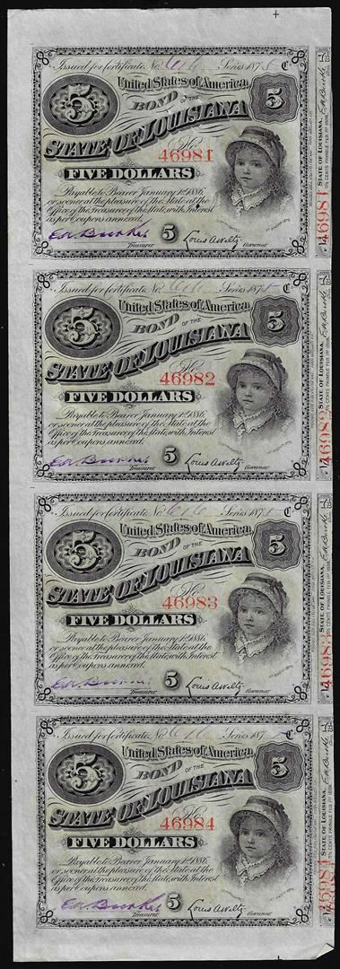 One Uncut Sheet of (4) State of Louisiana Baby Bond Obsolete Notes.
