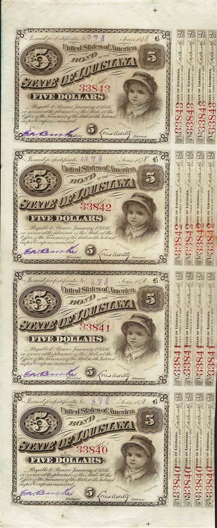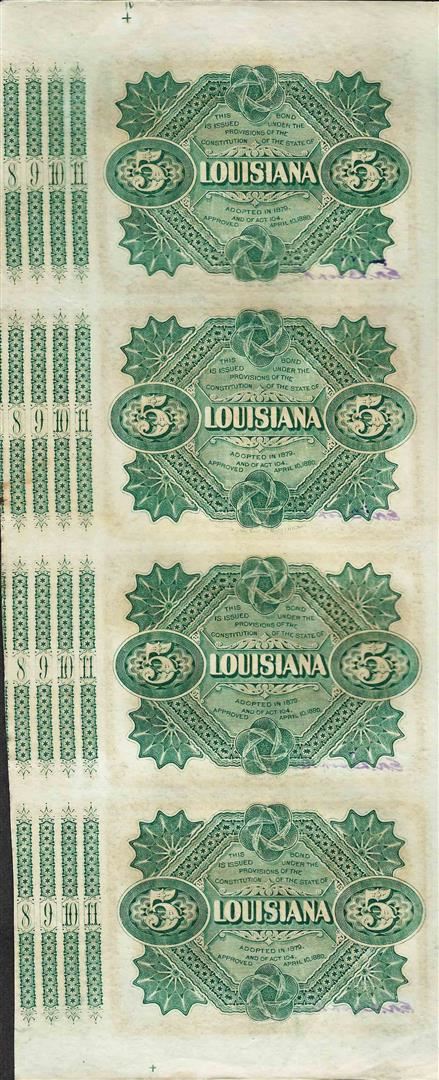 Uncut Sheet of (4) State of Louisiana Baby Bond Obsolete Notes