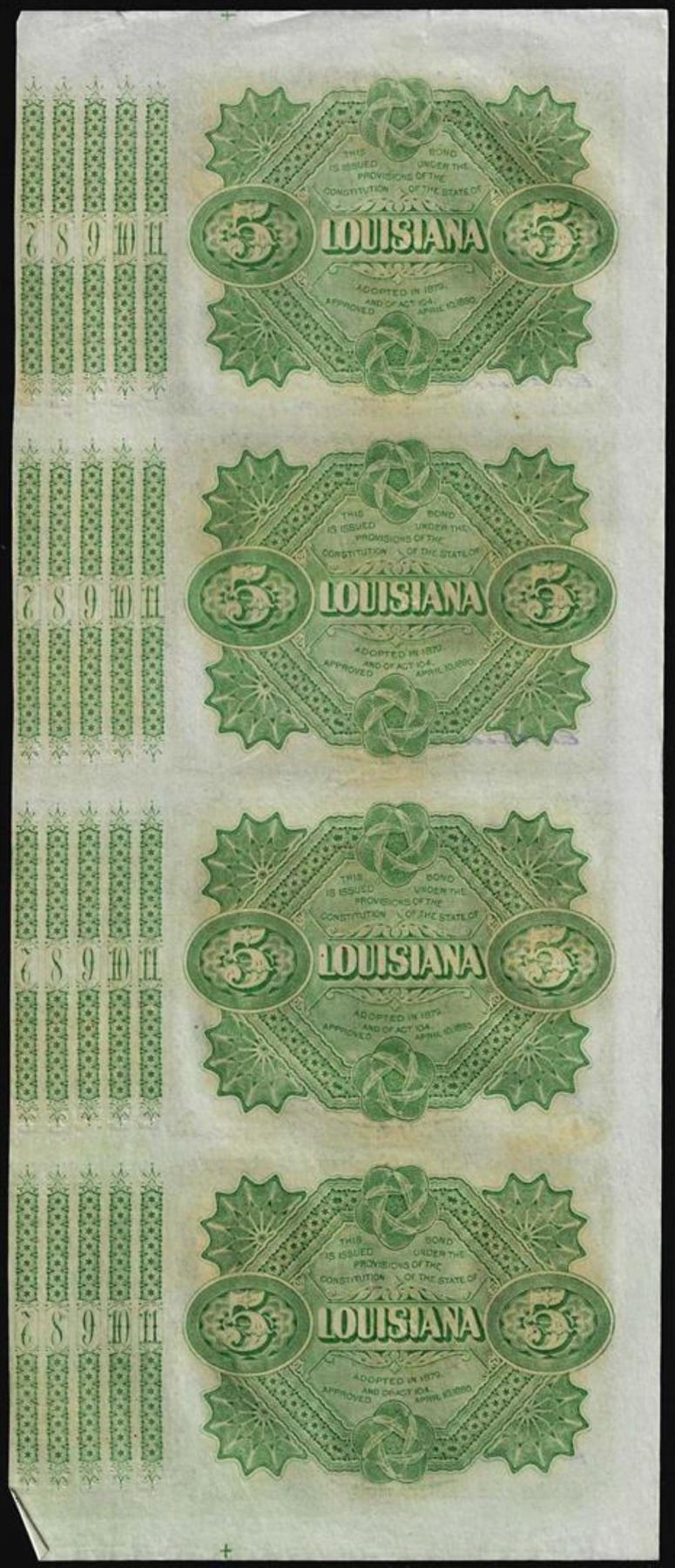 One Uncut Sheet of (4) State of Louisiana Baby Bond Obsolete Notes.