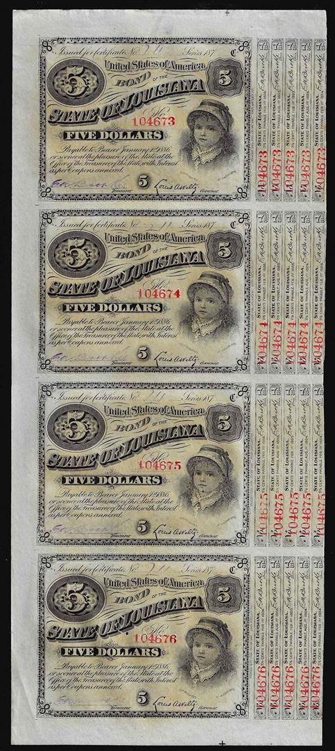 Uncut Sheet of (4) State of Louisiana Baby Bond Obsolete Notes