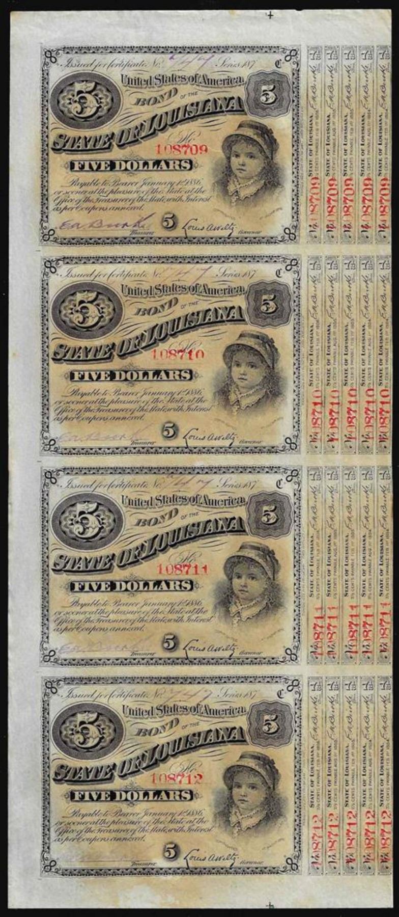 One Uncut Sheet of (4) State of Louisiana Baby Bond Obsolete Notes.
