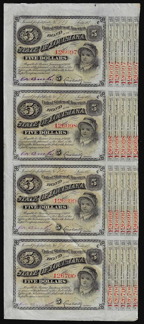 Uncut Sheet of (4) State of Louisiana Baby Bond Obsolete Notes