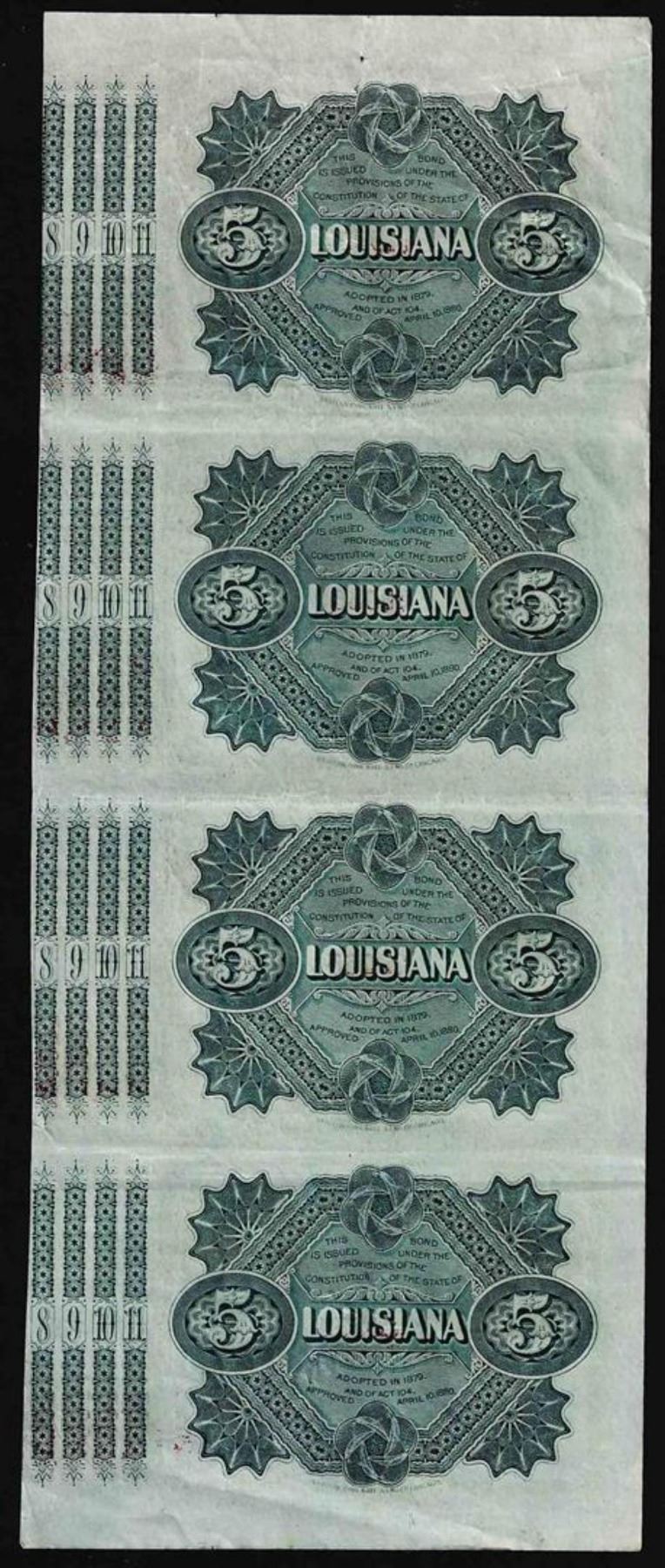 One Uncut Sheet of (4) State of Louisiana Baby Bond Obsolete Notes.