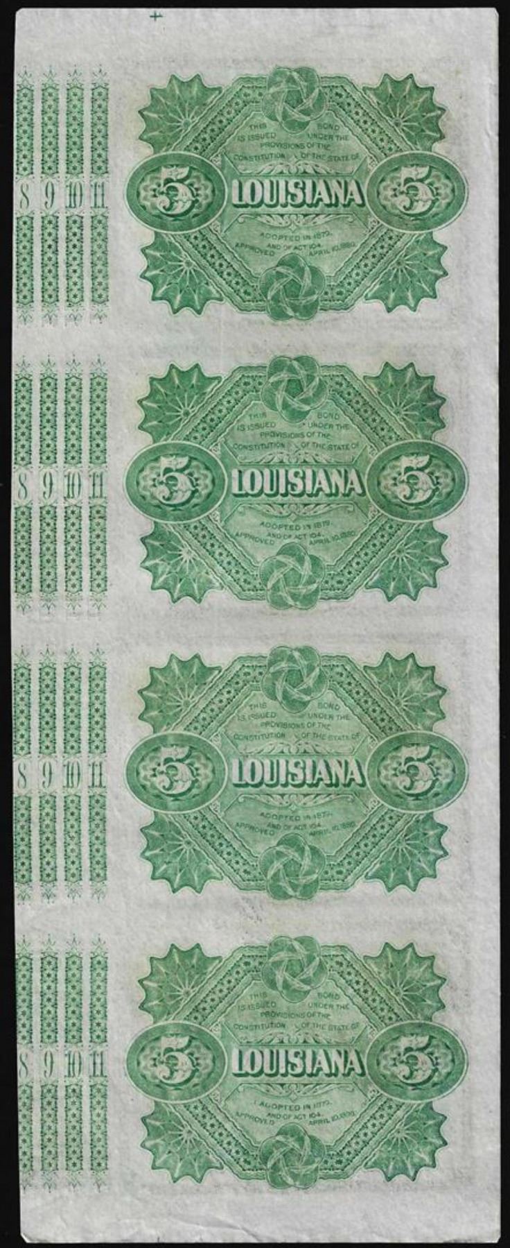 One Uncut Sheet of (4) State of Louisiana Baby Bond Obsolete Notes.
