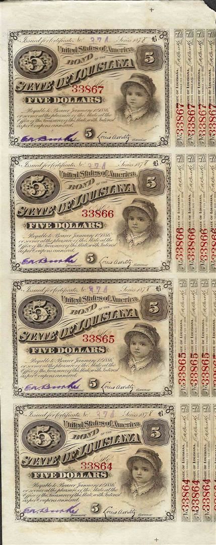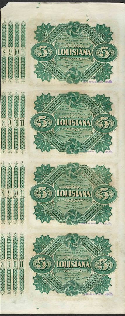 Uncut Sheet of (4) State of Louisiana Baby Bond Obsolete Notes
