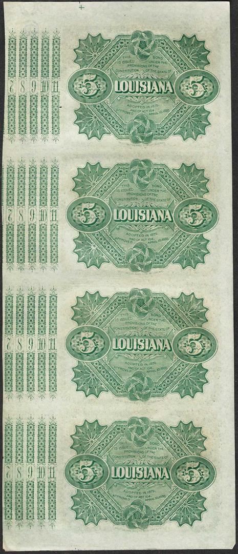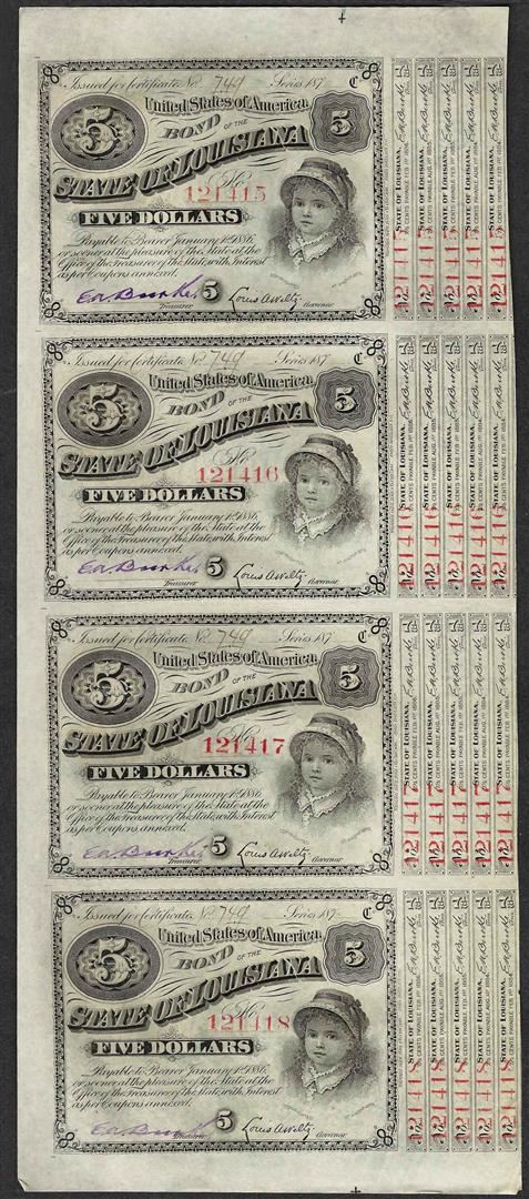 Uncut Sheet of (4) State of Louisiana Baby Bond Obsolete Notes