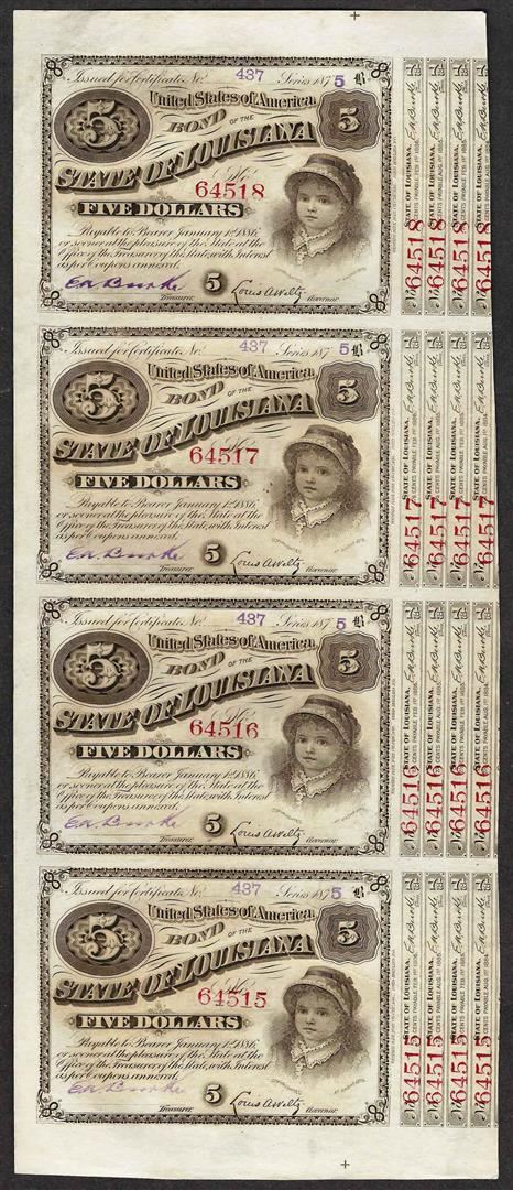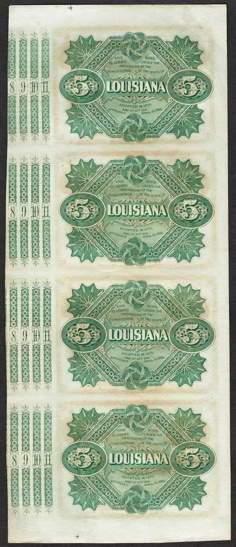 Uncut Sheet of (4) State of Louisiana Baby Bond Obsolete Notes
