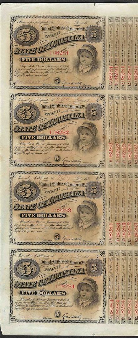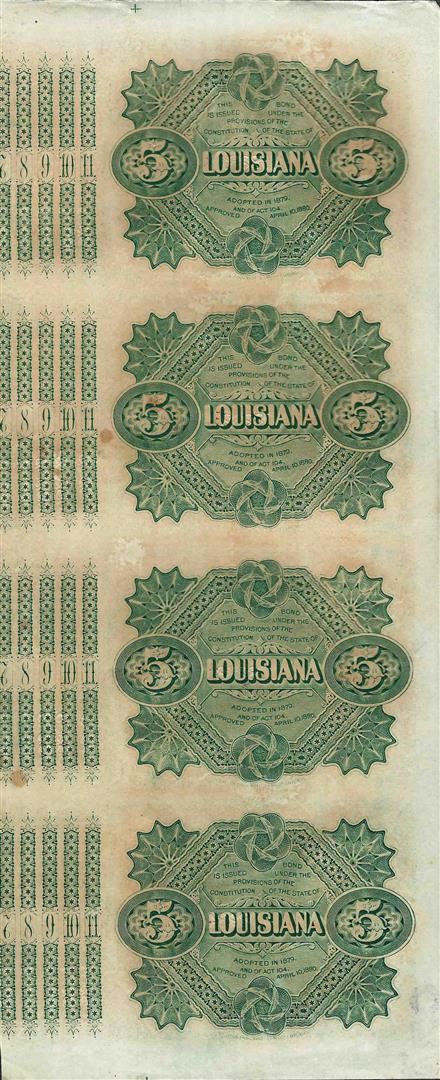 One Uncut Sheet of (4) State of Louisiana Baby Bond Obsolete Notes.