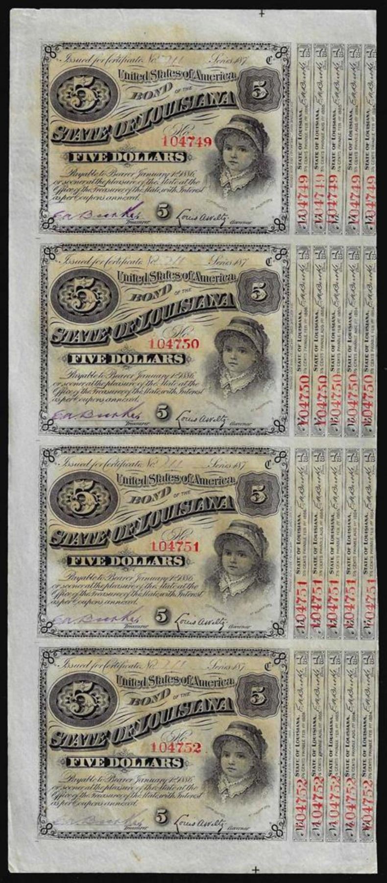 One Uncut Sheet of (4) State of Louisiana Baby Bond Obsolete Notes.