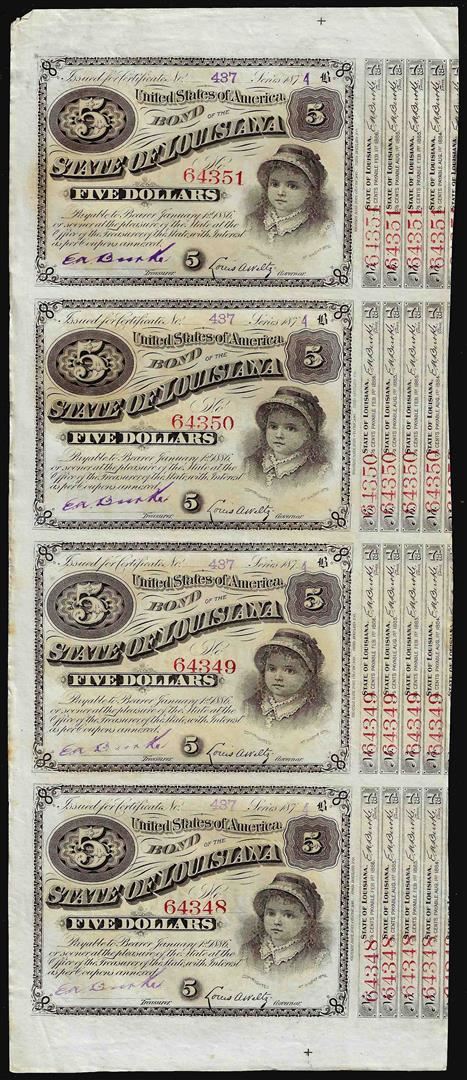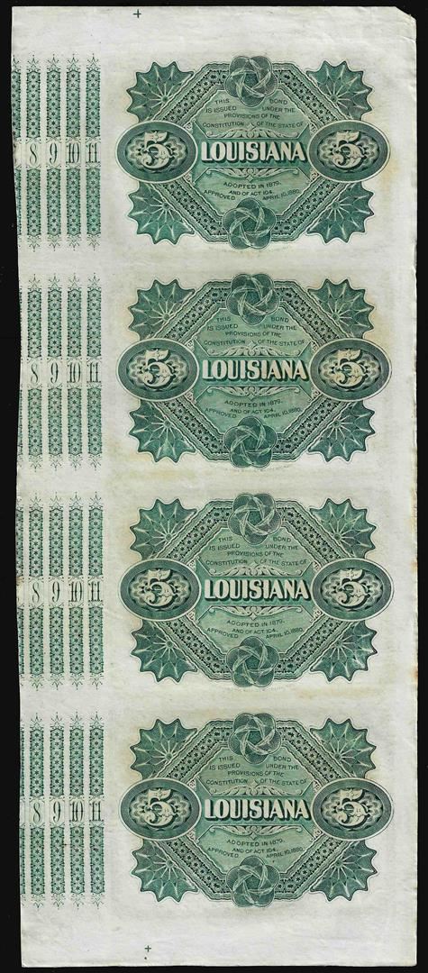 Uncut Sheet of (4) State of Louisiana Baby Bond Obsolete Notes
