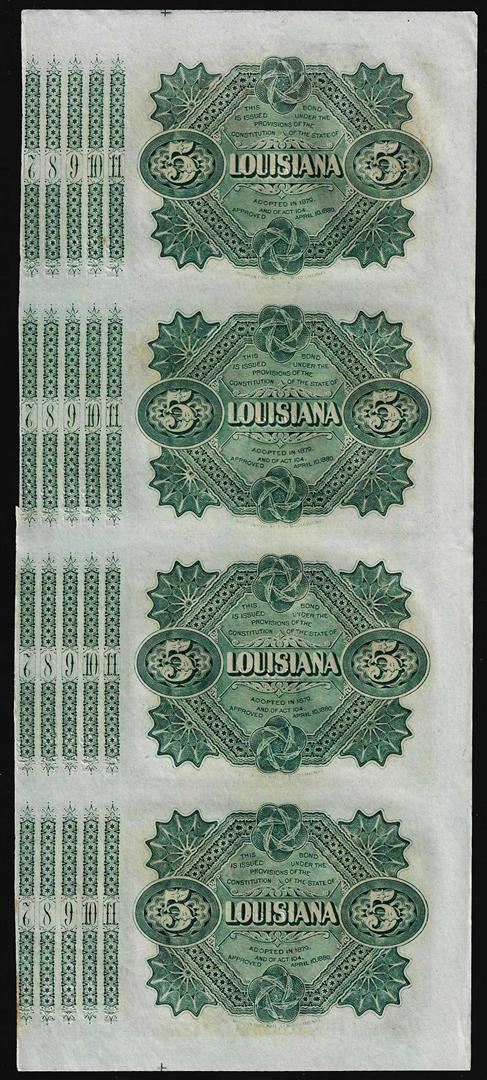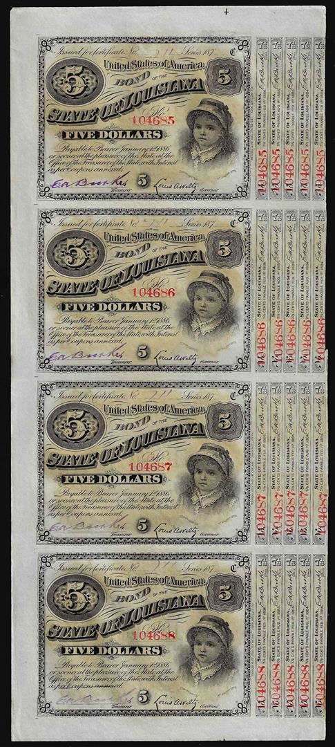 Uncut Sheet of (4) State of Louisiana Baby Bond Obsolete Notes