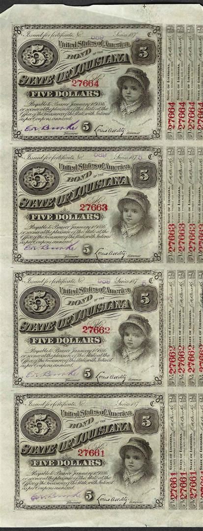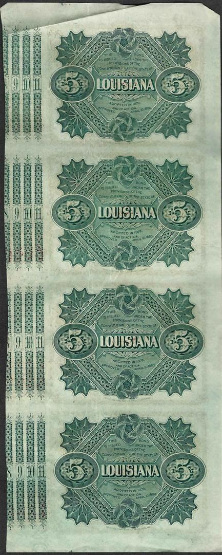 Uncut Sheet of (4) State of Louisiana Baby Bond Obsolete Notes